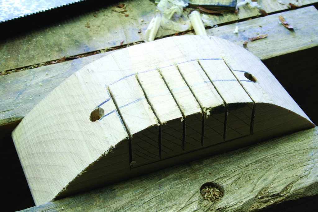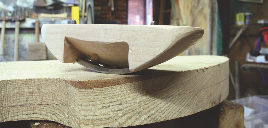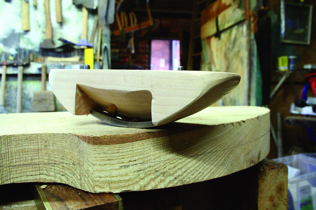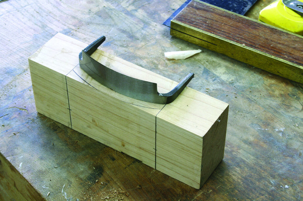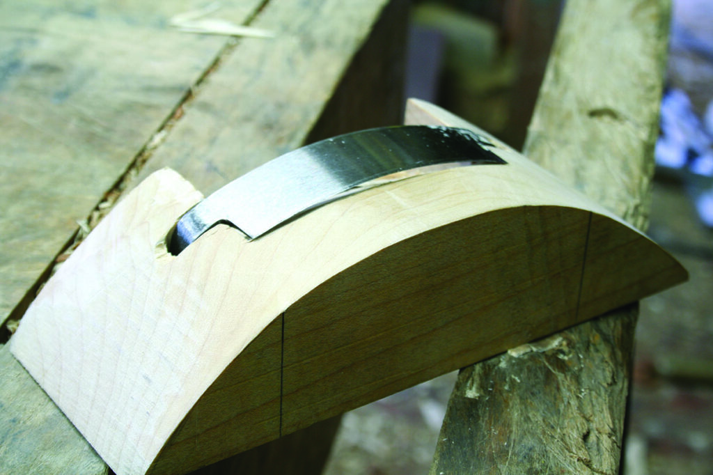 Use a spokeshave to clean up the saw marks, adjusting the curve to finally match the curve of the blade to the body. The sole of the travisher should slope slightly away from the blade edge.