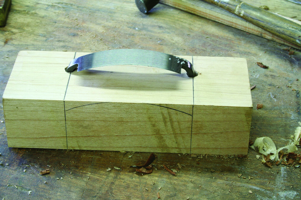 7. Turn the block over to the adjoining face with the tangs lining up with your previous marks and draw in the curve of the blade.