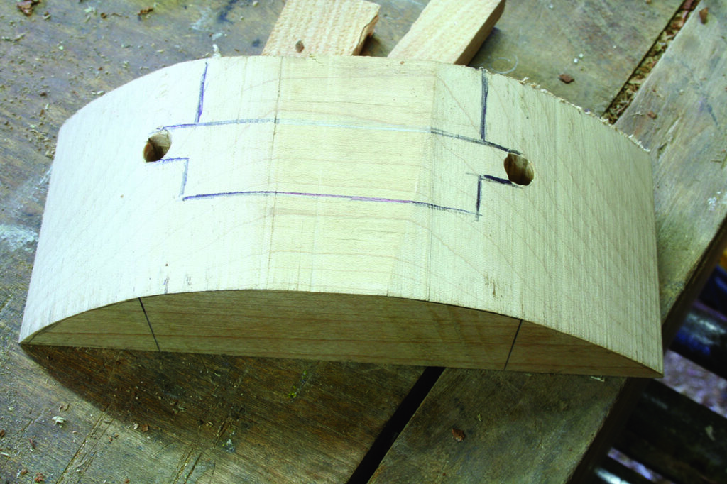 11. Once the blade is seated, remove the blade and cut out the previously marked curve. With the body curved, enlarge the tang holes again until the blade sits onto the wood. You can now mark the outline of the blade. The wood inside the line is waste and needs to be removed.
