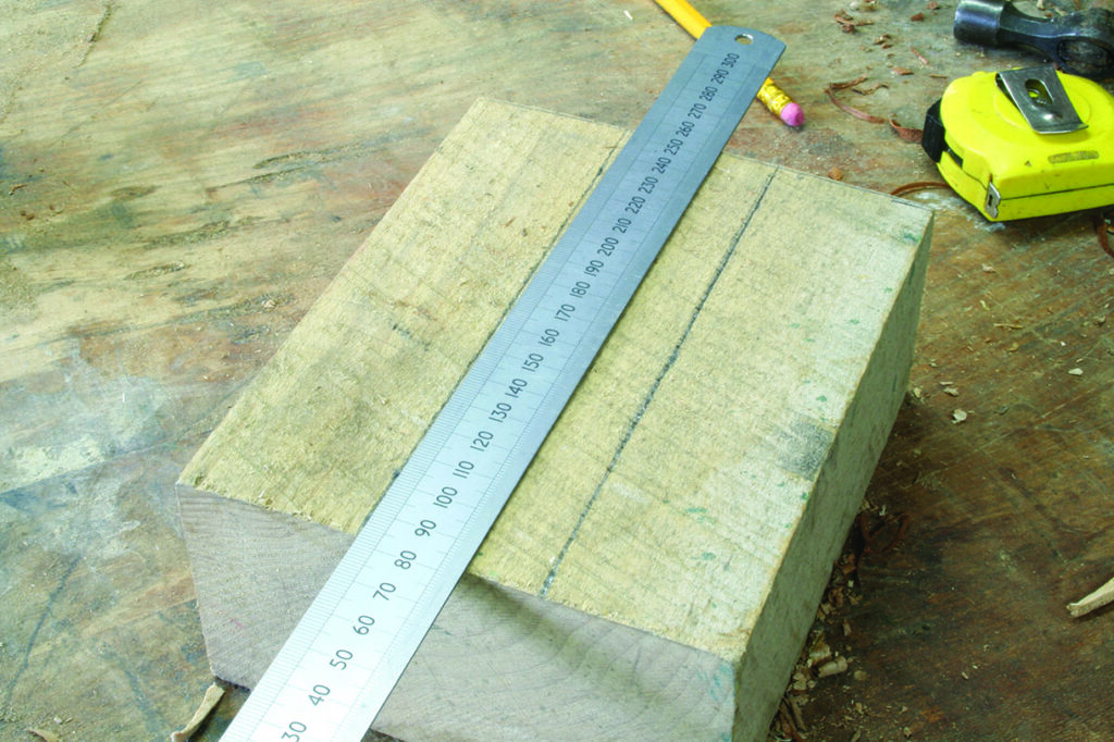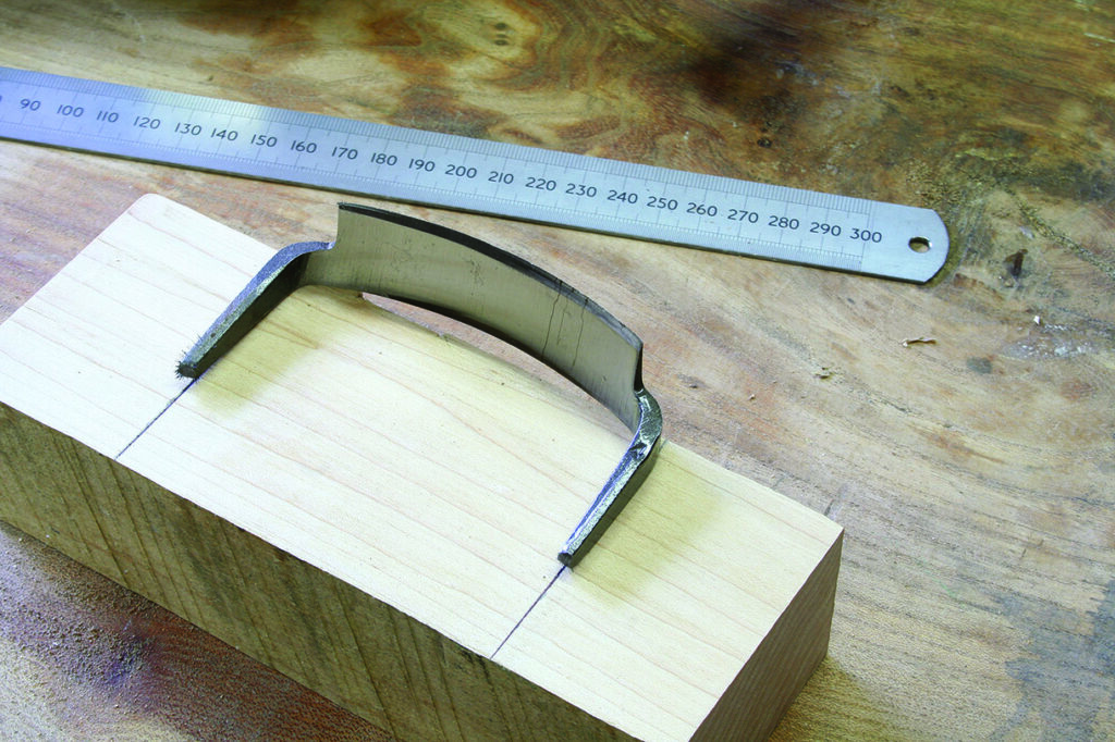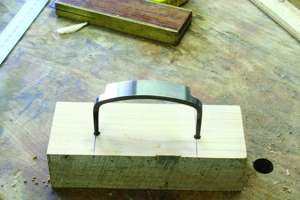 6. Use the blade as a template for marking. On the wider face, mark the centre point of each tang. The blade needs to be seated in the middle of the block.