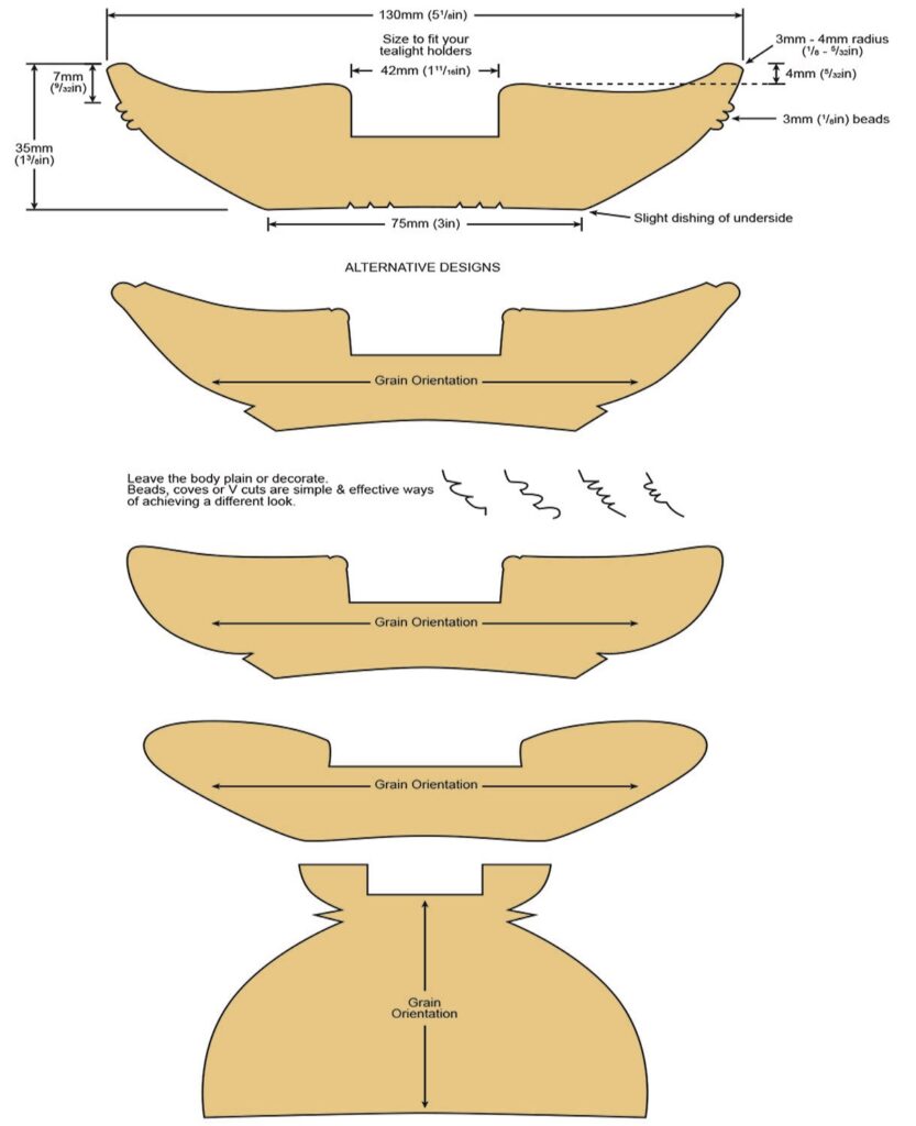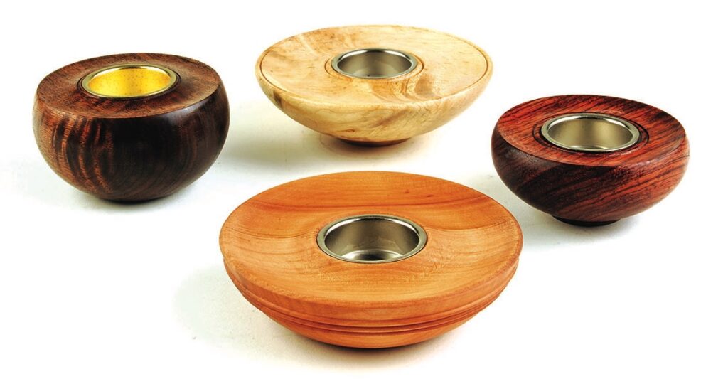 Tealight holders may seem a bit old hat or not something often thought about as a prime project for turning. That is a shame because they are functional, well liked as presents, they sell well at craft events and, depending on the grain orientation selected, are either spindle turning – a squat or tall form of a wide candlestick – or, if faceplate grain orientated timber is selected, the processes used are the same as those used for turning bowls but with a smaller internal hole. These are great items on which to practice and refine your turning skills. There are myriad design options to explore and you can choose almost any timber you like, whether it be figured or plain. They do not take a lot of timber so are low cost – unless you splash out on a rare or highly figured piece of wood – and can be very quick to make, so are ideal for us time-poor turners who want to have fun and make something useful when we get time in our workshop. This article shows how to make one and also gives you a few design variants.