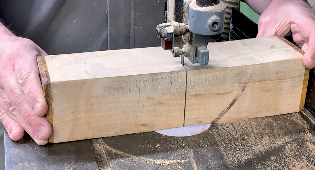 3. Let’s start by cutting the mallet head timber to size. The blanks are already 300mm, so all we need to do is cut them exactly in half. Measure accurately with a rule and make a shallow cut with the bandsaw, then flip the timber over and use the cut line as a sight line to cut along