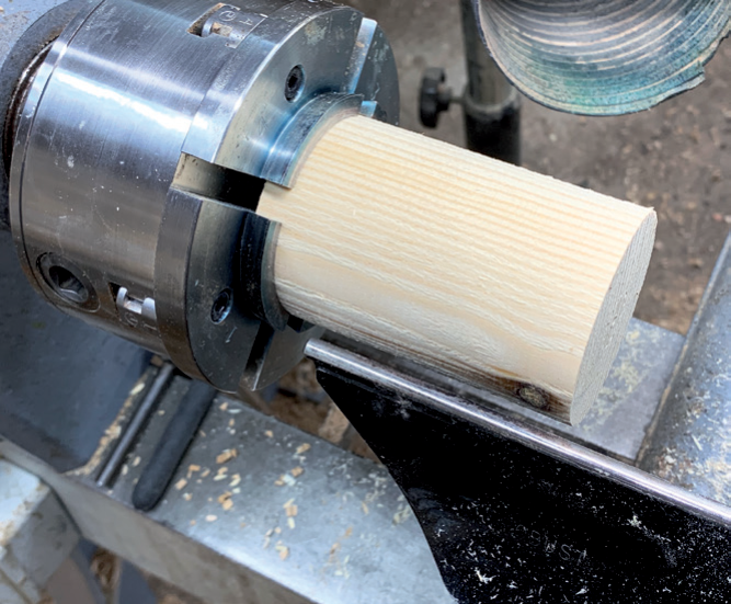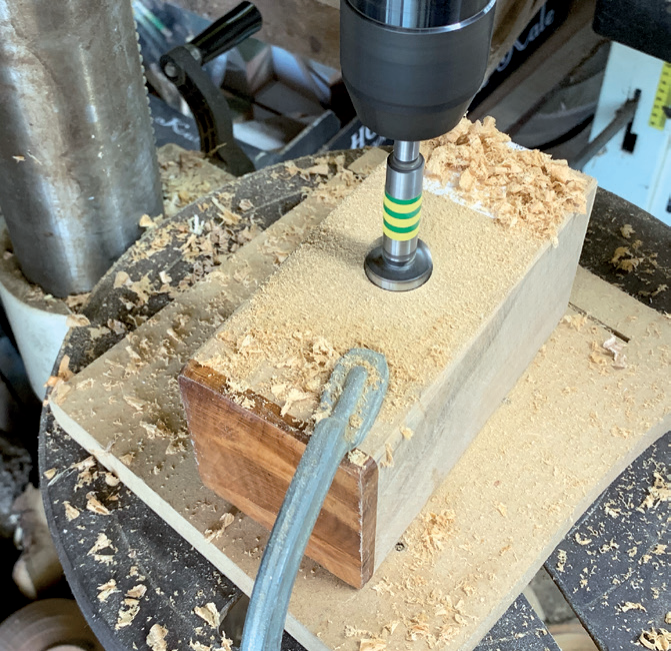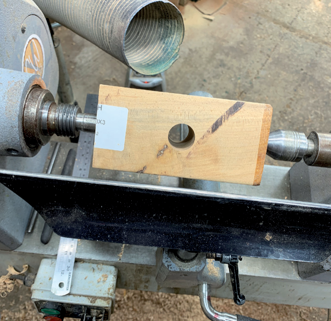 7. Now that you have your hole all the way through the blank it can be mounted to the lathe, taking as much care to centre between centres as you did to drill the hole centrally. We’ve drilled first as it’s much easier to drill while the blank is square than if we waited until turned and had to contend with a holding issue and potential for drill breakout