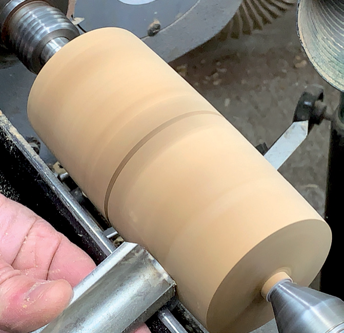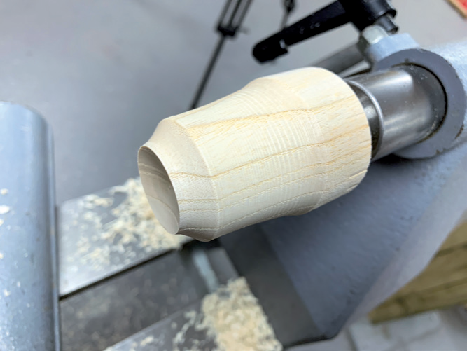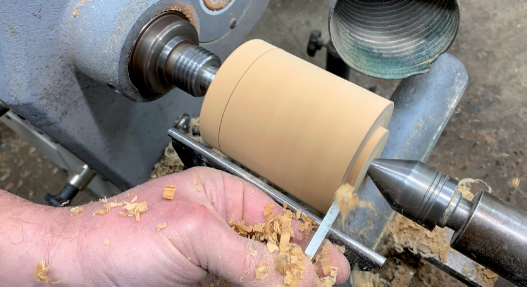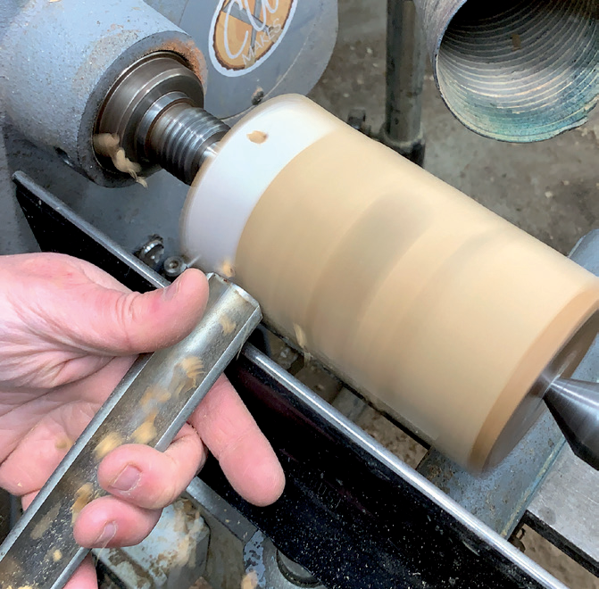 8. Now you can take your blank down to a cylinder ready for shaping – this is a fairly straightforward procedure using the spindle roughing gouge. Take gentle cuts with a slow feed rate to keep the cut clean but don’t be tempted to check for round with your hand while the piece is moving as we must not forget it has a hole through the centre which could catch your fingers