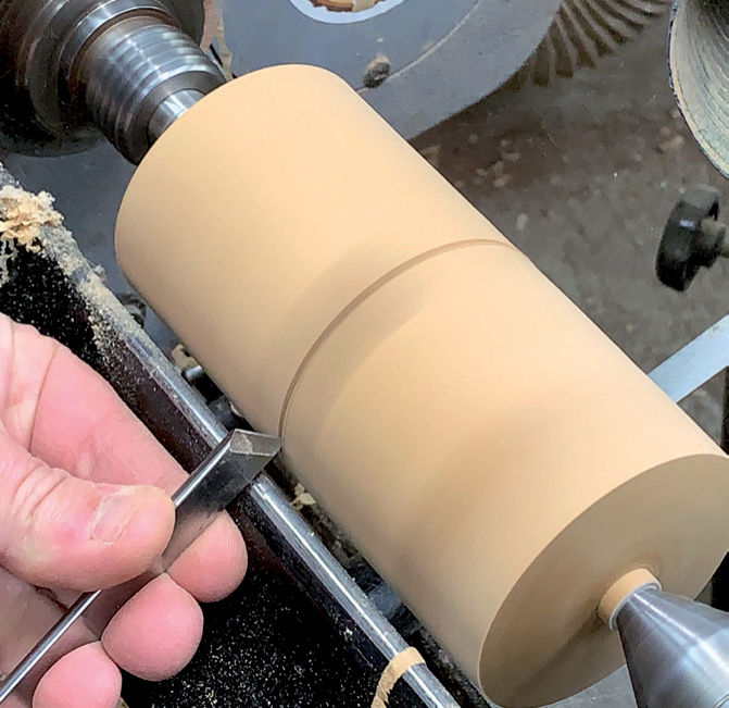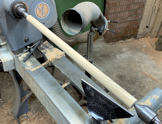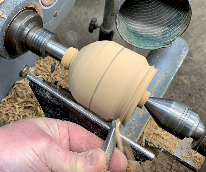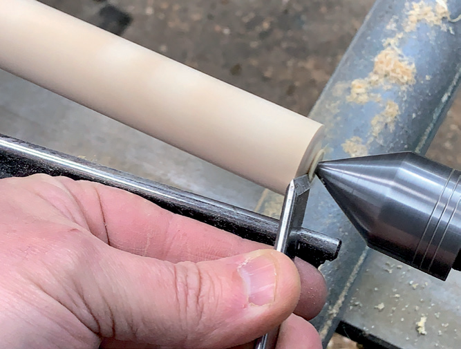 37. Start by cleaning the end nearer the tailstock, I find this best with a skew chisel to slice the grain and give a clean finish. Avoid a parting tool as this will tear the grain badly. Also make sure you leave enough spigot supporting the centre, otherwise it could break prematurely