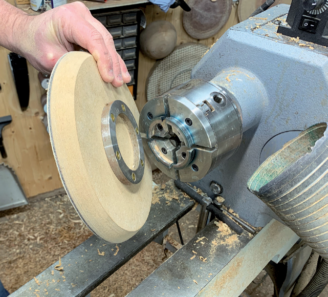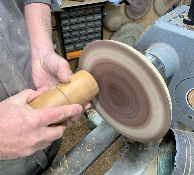 12. After sanding through the grades and you’re happy with the finish, take the mallet head off the lathe and repeat on the other three. Once all the heads are complete mount your sanding disc ready to take off the nibs where the drive and tailstock centre were. The one I’m using is fixed to my chuck using a faceplate ring