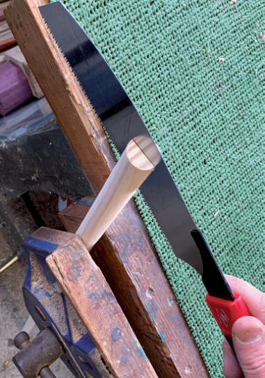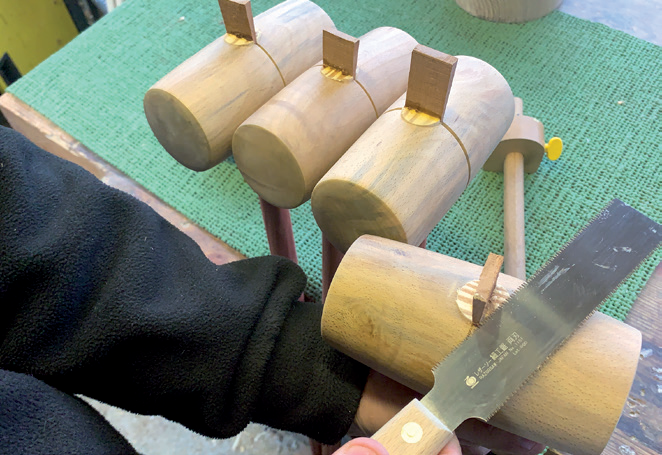 19. The glue is now dry and we can cut the waste away from the wedges. Again, it’s important not to mark the mallet heads and my preferred tool for this is the Japanese flush-cut pull saw. This is a very flexible saw, but because it has no set can be used right up against the timber without marking it