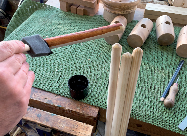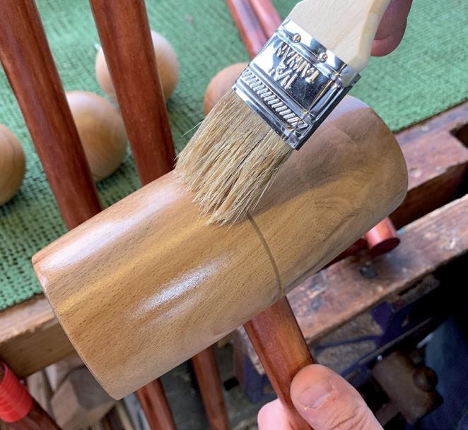 15. The broom handles are a very quick-grown softwood and incredibly pale, so I’ve decided to stain them dark stain. In this case I had some old rosewood stain lying around since about 1985, so decided to put it to good use. I find using a foam brush to apply the stain saves an awful lot of mess and keeps the stain where you want it. Try to avoid staining the area to be inserted into the mallet head