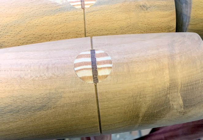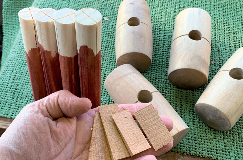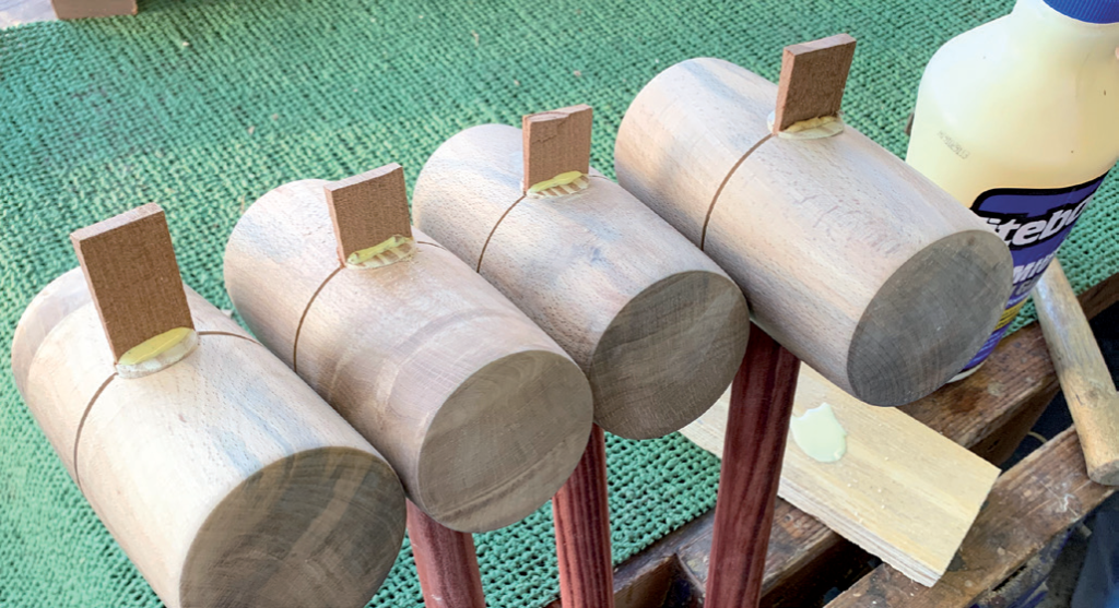 21. This is what the heads look like with the contrasting wedges in and everything sanded. The next stage is to consider the type of finish you want to use and to consider the conditions you will be playing in. This is a summer game, but grass can be wet and I would always go for a weather-resistant finish