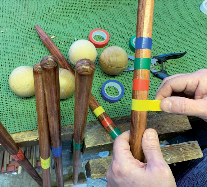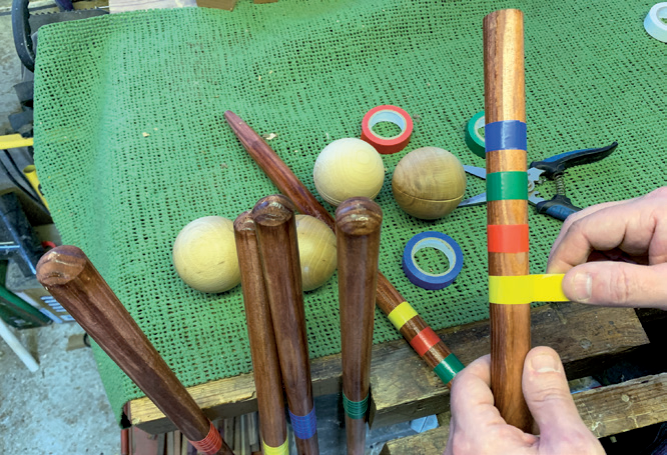 23. Once everything has had a good couple of coats of varnish you can add the colours. I’m using tape to distinguish the individual teams and am going to stick with the primary colours – red, blue, green and yellow. Each mallet should have one colour with one matching ball, while the scoring sticks have all four colours