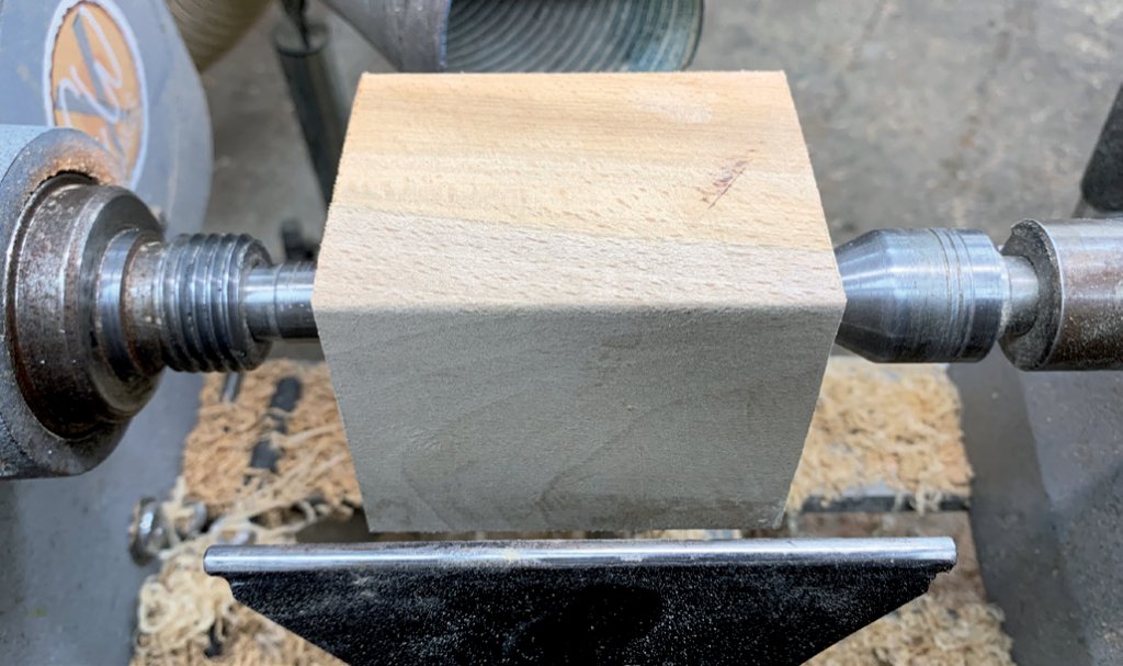 25. Turning a ball is much easier than you would assume. Start by holding your blank between centres using a regular drive centre, such as a pro drive or small four-prong drive, and a ring centre in the tailstock. I’ve chosen to leave the corners of the blank on here, but if you choose you could take them off on the bandsaw first