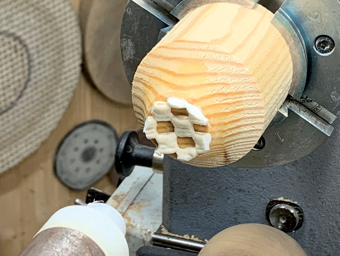 30. To shape the drive use a 6mm bowl gouge to create a dished recess, then taper toward this cup as in the picture. To make sure you don’t get any burn or burnish marks from the timber, glue on a small amount of router non-slip matting