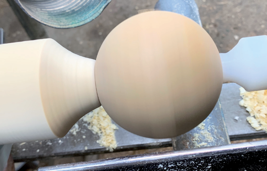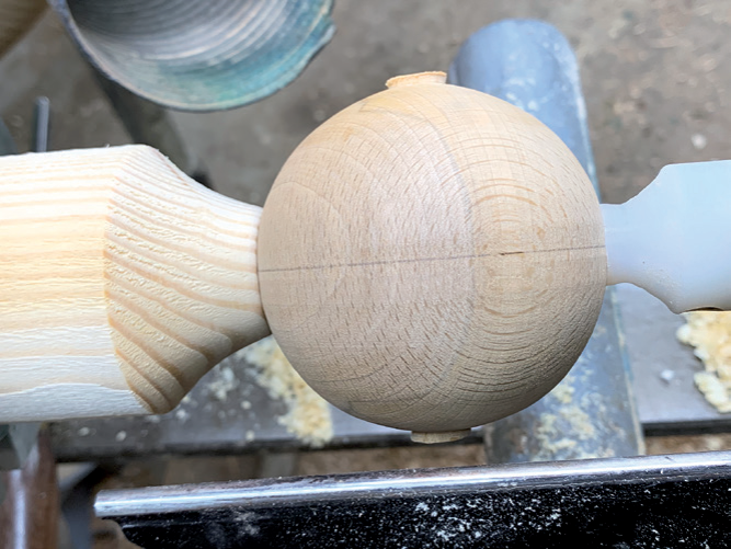 32.The ball is now being held at 90° to its original position and the original centre points at the top and bottom are ready to be turned away. Make small cuts to slowly remove the waste and periodically stop the lathe and rotate the ball to turn another section. This will make the ball completely spherical