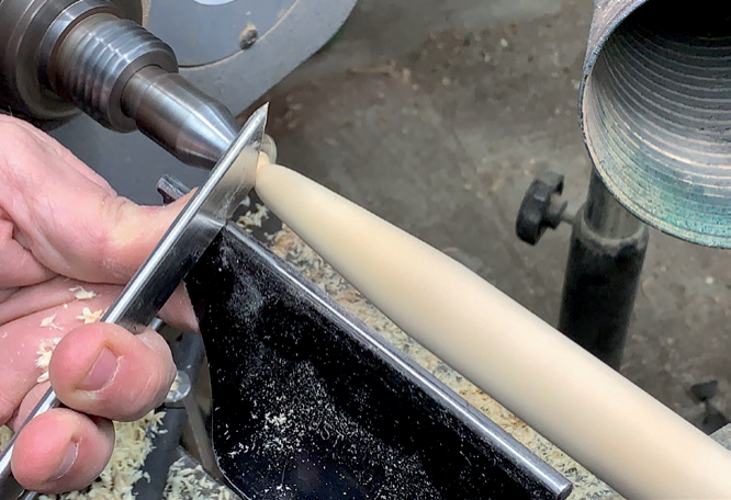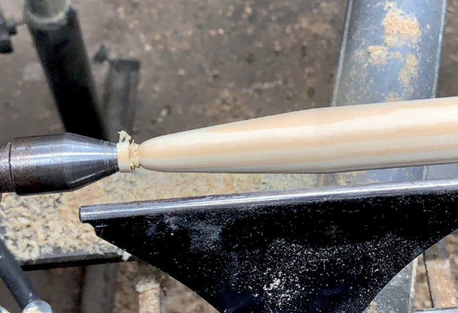 38. The business end on the scoring stick is a gentle taper – imagine the shape of a cricket stump and you’re on the right track. The skew really is the right tool for this, making planing cuts to create the timber. Once again, make sure you leave enough to give strength while sanding