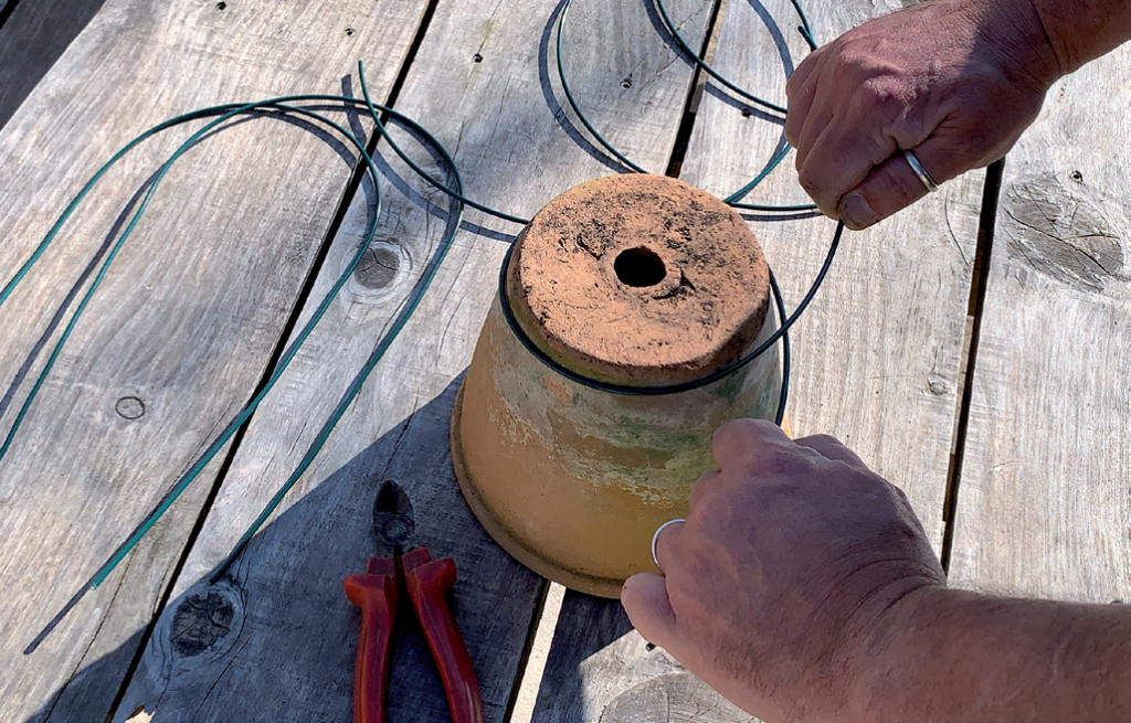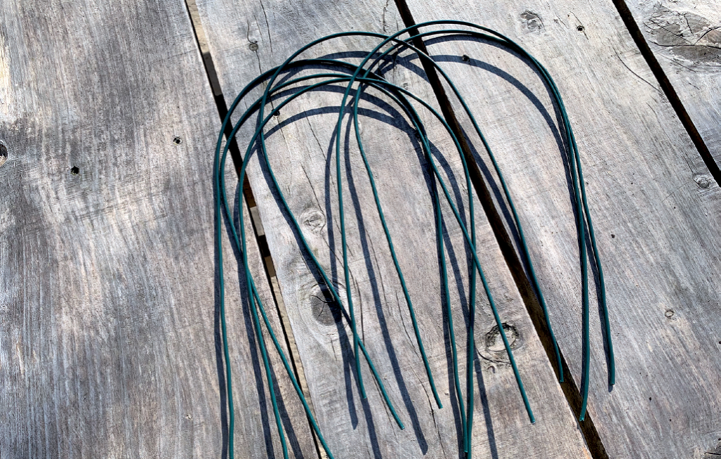 41. So, on to the final part, the hoops. You could turn a set of three sticks and rest one on top of the other two, again like cricket stumps. You could buy some plumbing pipe and 90° angles to create the hoop or, like me, buy some thick gauge garden wire and bend it around a plant pot