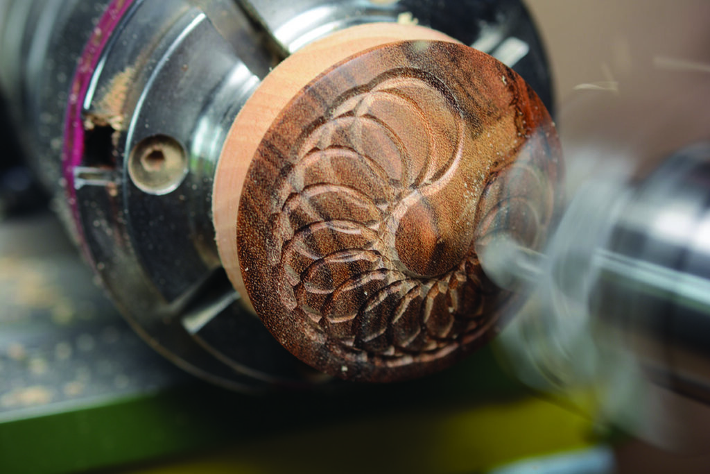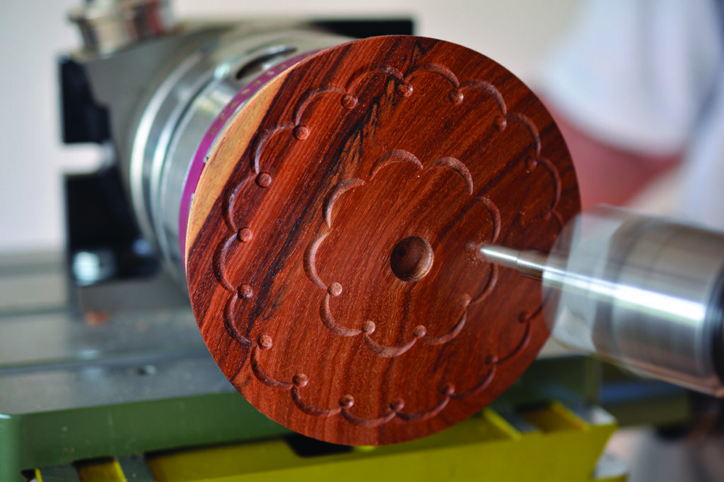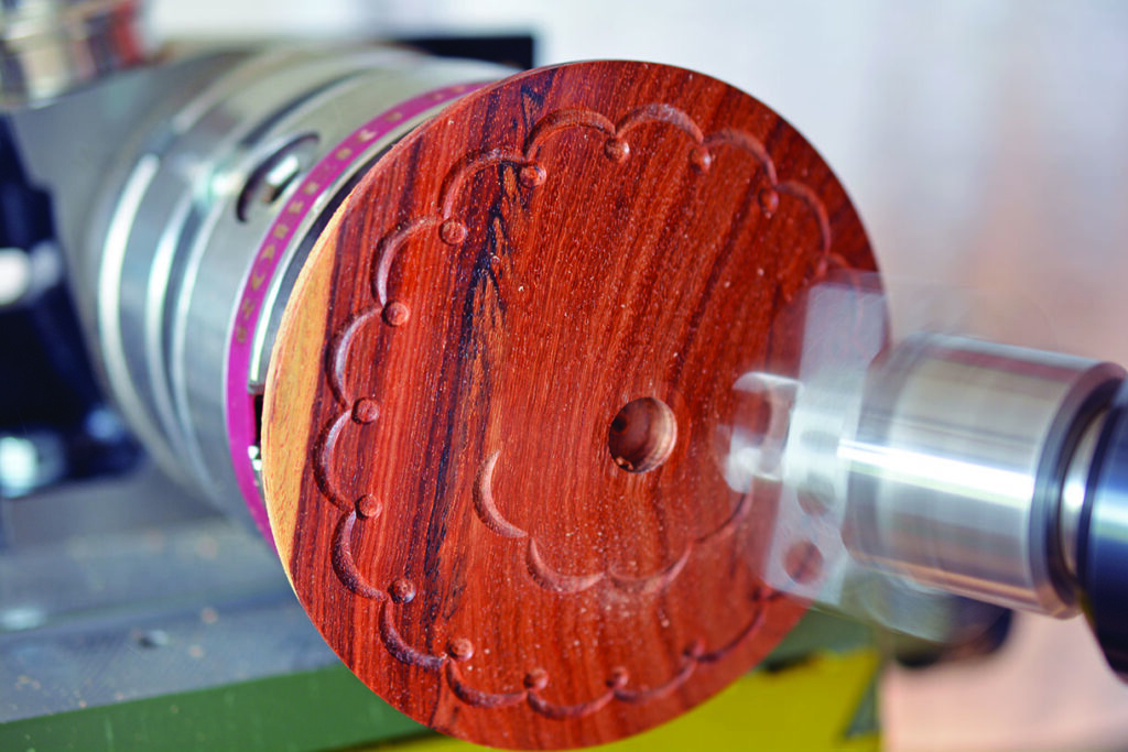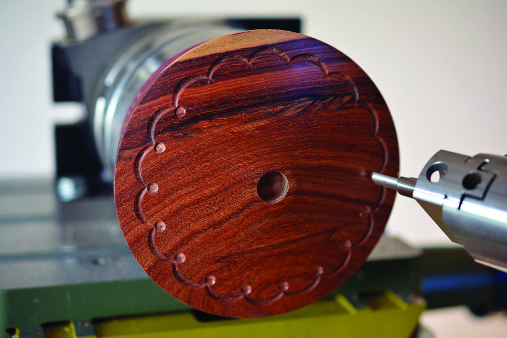 What you don’t see demonstrated so frequently is the lathe’s ability to achieve wonderfully intricate details that lend a grace and charm. The rotating motion naturally lends itself to repetition and accuracy, and this is another feature of the lathe’s arsenal. In this article, Chris Hart focuses on setting up his system to demonstrate a series of box lid decorations. N.B. There is a lot of technical detail relating to setup, so it’s best to refer to the pictures to aid clarity.