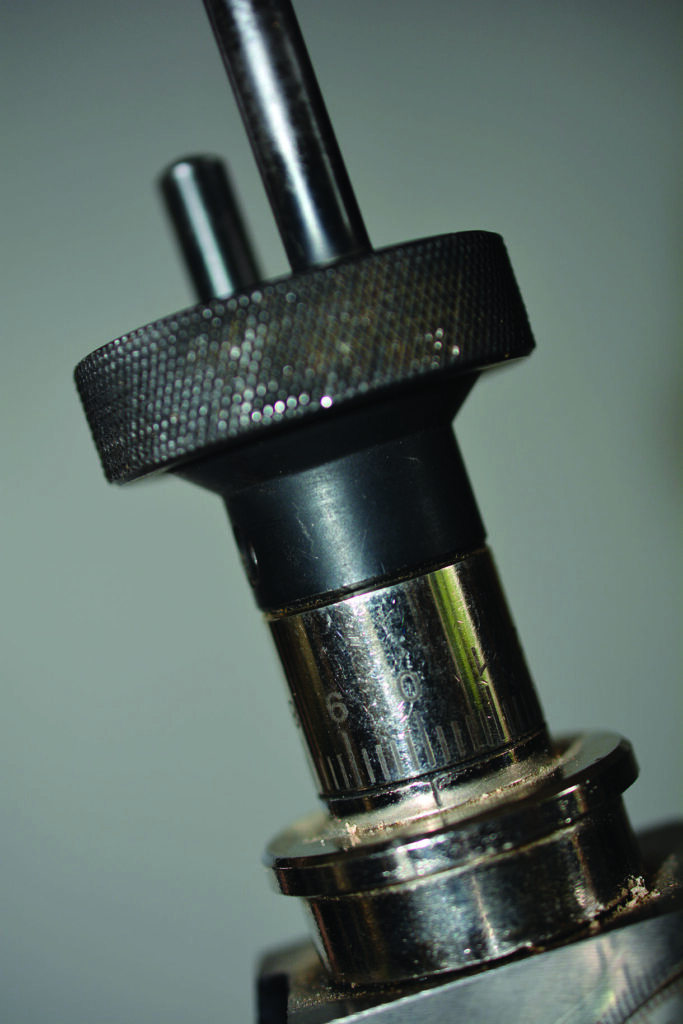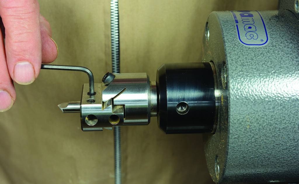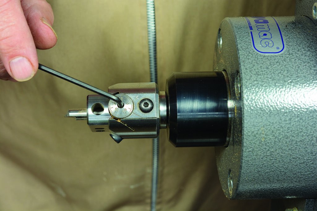 Setting up the boring head is the next task. Start by inserting the boring head via the Morse taper into the spindle and secure with the drawbar. Insert the cutter into the middle slot on the head and secure with the retaining screw. The cutting edge must point upwards if the direction of travel is anticlockwise – the normal lathe direction. If the direction is reversed, turn the tool bit 180°. The swing of the head is adjusted by an Allen key inserted into the Vernier scale on the head and locking off with the screw on top.