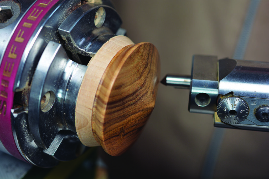 To align the cutter, turn the rotary table to 10°, then adjust the compound table, placing the tip of the cutter where the crescents intersect. Making a very light cut will indicate the accuracy of the position, allowing final adjustment prior to cutting. To complete the inner crescents, including dots, repeat the process, making allowances for a smaller diameter and shorter crescents. To finish the lid, reverse the finial recess into a jam chuck, enabling the chuck spigot to be removed. Complete the inside of the lid, and finally glue the finial in place.