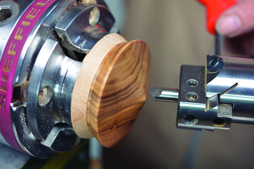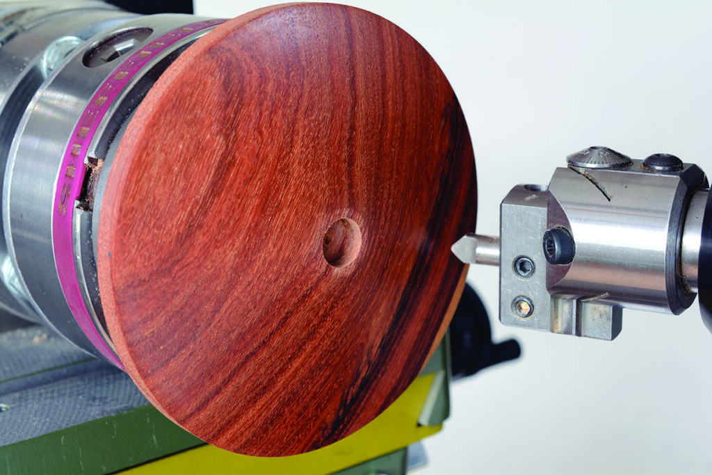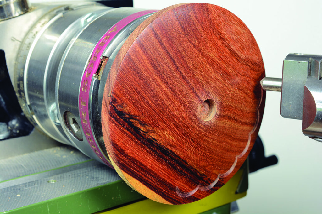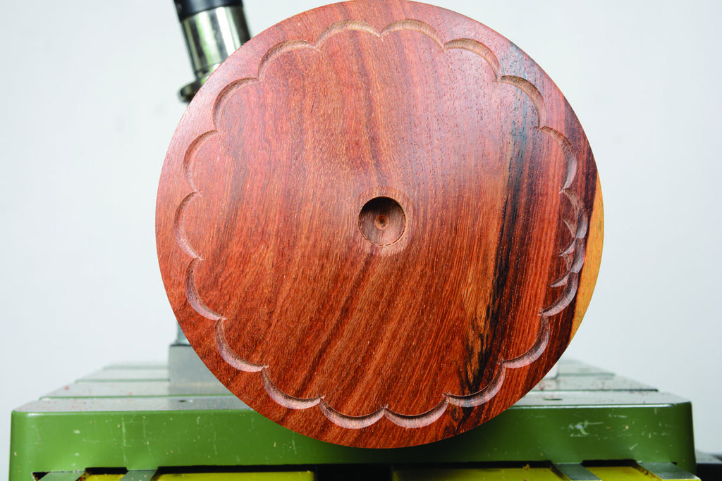 While making the lid for this article, with two cuts left on the outer circle, I failed to rotate the table to the correct mark – the result can be seen in the photograph above. I was then faced with the decision to change the pattern or start again. Fortunately, the piece was thick enough to skim.