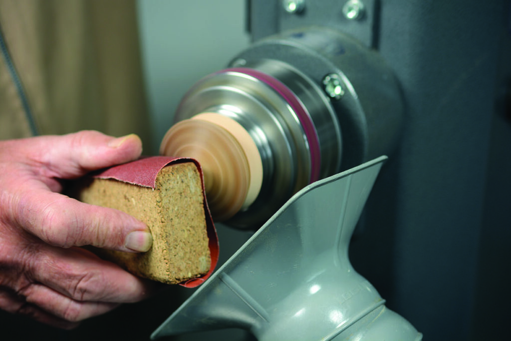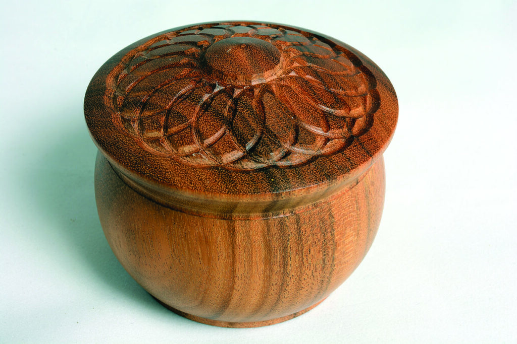 The first project is a box lid in curupay (Anadenthera culbrina). Having finished the base and inside the lid, reverse the lid into a jam chuck. The shape of the lid is a sloping hut roof style, and great care must be taken to achieve this profile.