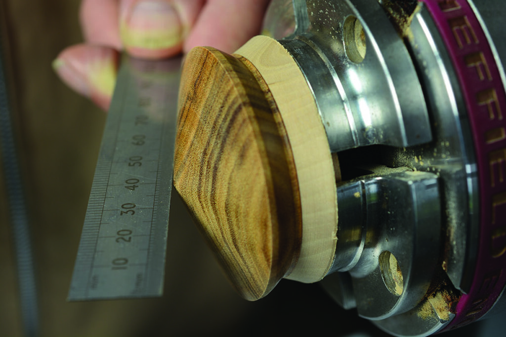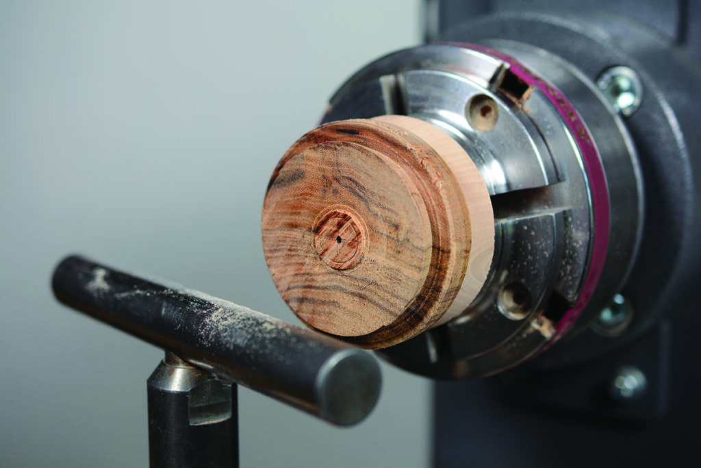 The second project is a trinket box lid inspired by my favourite and constant inspiration woodturning book Turned Boxes 50 Designs by Chris Stott. The woods used are beech (Fagus sylvatica) for the base, and for the lid, West African pao rosa (Swartzia fistoloides) topped with an ebony (Dispyrus crassiflora) finial. I turned, sanded and finished the lid exactly the same as the first project. I also drilled a 12mm hole to house the finial, which also doubles as a ‘jam chuck’, enabling the underside to be completed.
