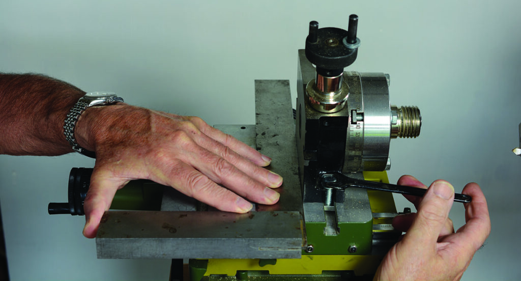 Having finished the preparation of the lid, the tailstock and banjo are removed and replaced with the baseboard and compound table. Securing onto the bed bars of the lathe, mount the rotary table and ensure it sits square on the compound table by using an engineer’s set square.