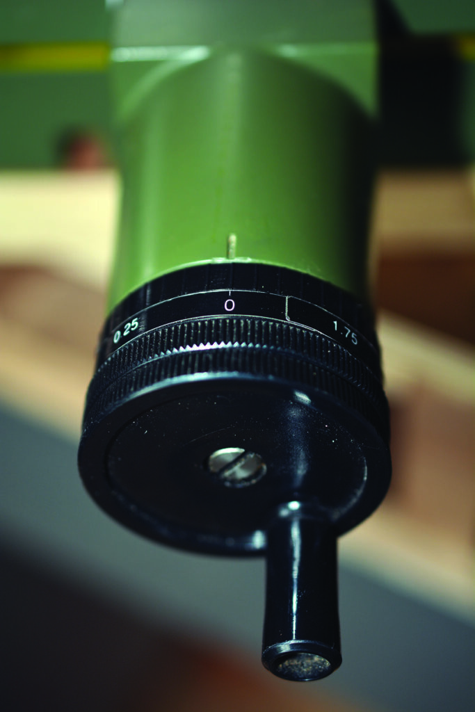 To make the process a little easier, I like to use the increments in multiples of 10. Continue to adjust until you are happy with the proposed cut. Secure all the components. Carry out the safety checks, then make the first light cut. This will give you an indication of the shape, from which you can make fine adjustments – a full cut will then cover the initial one. Now continue completing the cut. Once the outer crescents are completed, it’s time to cut the dots and wind the work away from the cutter. Remove the cutter, and replace with a straight fluted router cutter. Now centralise the dovetail slide using the zero on the Vernier scale for fine adjustment. The cutter should now run true.