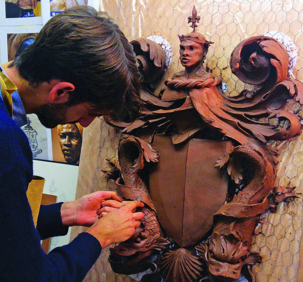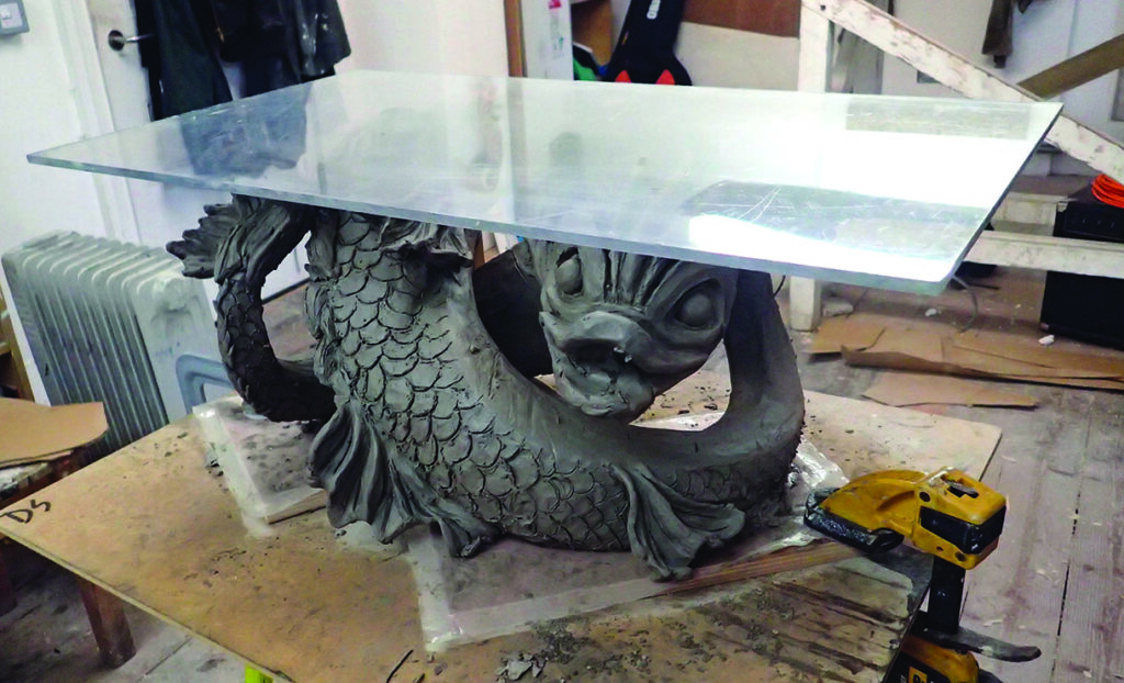 The Art School was also contacted by a member of the Worshipful Company of Fishmongers, which was looking for someone to carve a dolphin coffee table. Wilfe Gorlin put together a beautiful design, with two classical dolphins twisted together to support a glass top. He is carving the piece in lime wood with silver gilt to finish. The joinery involved in this project is very complex due to the size and the fact the two dolphins are to be carved separately and then interlocked, but it’s going to look stunning when it’s finished.