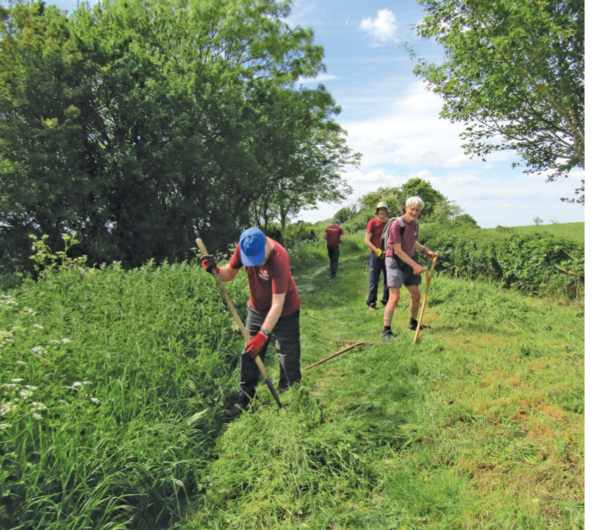 Clearing a bank next to the open grassland using scythes and rakes