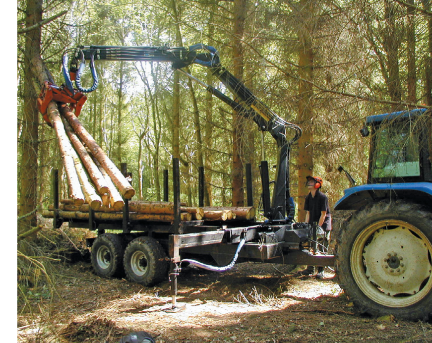 Freshly felled tree trunks being loaded on to a stake-sided trailer