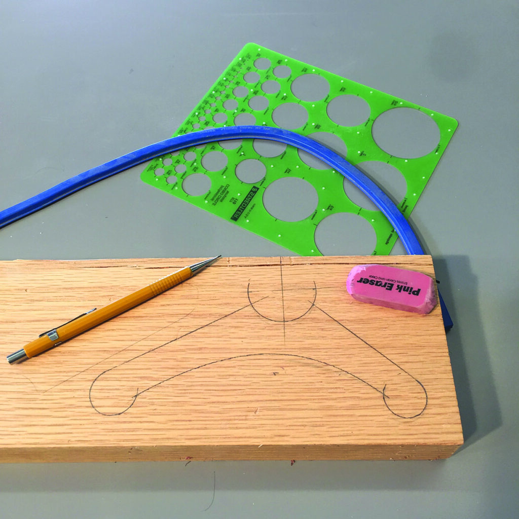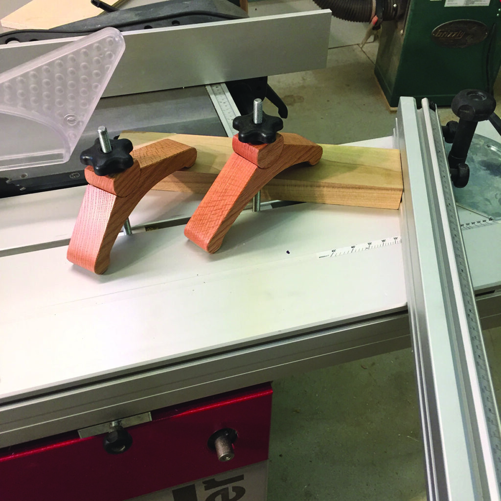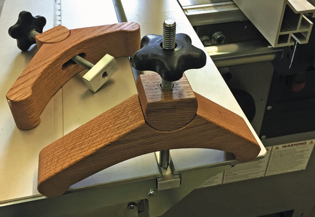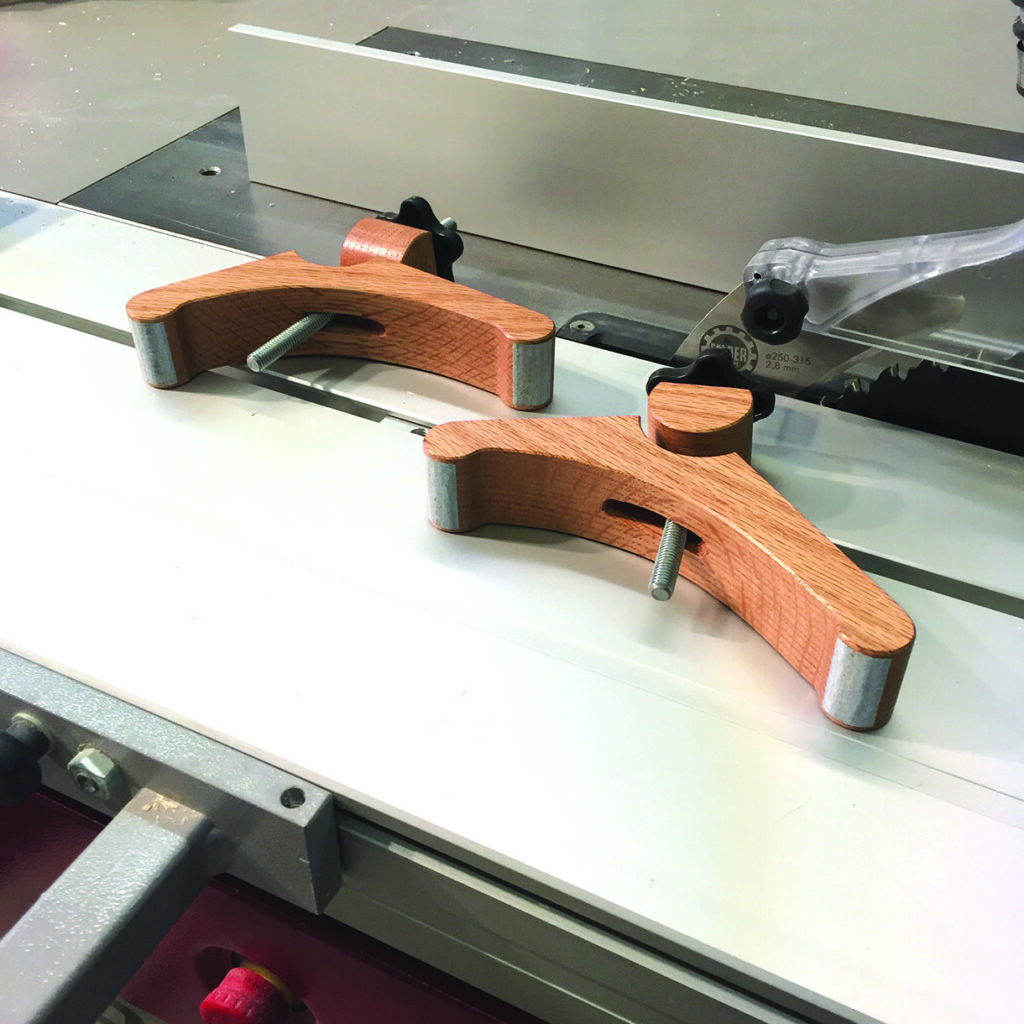 I created a pair of hold-down clamps from some 8/4 (commonly known here in the US and about 113⁄16in or 46mm) oak that utilise a simple ‘star’ knob and a section of ‘all thread’ bolt section. I wanted the clamps to be as versatile as possible in relation to the height or thickness of material that they could clamp down to the sliding part of my Hammer K3. Using a fair curve jig and some drafting templates, I laid out the overall shapes of two identical clamps. The oak clamps consist of the main body or clamp itself and a pivoting (circular) section that engages in a saddle of the clamp body. These are similar to a shop-bought design commonly used at a drill press or a crosscut sled, but I wanted mine to be larger in order to clamp up to about 31⁄2in