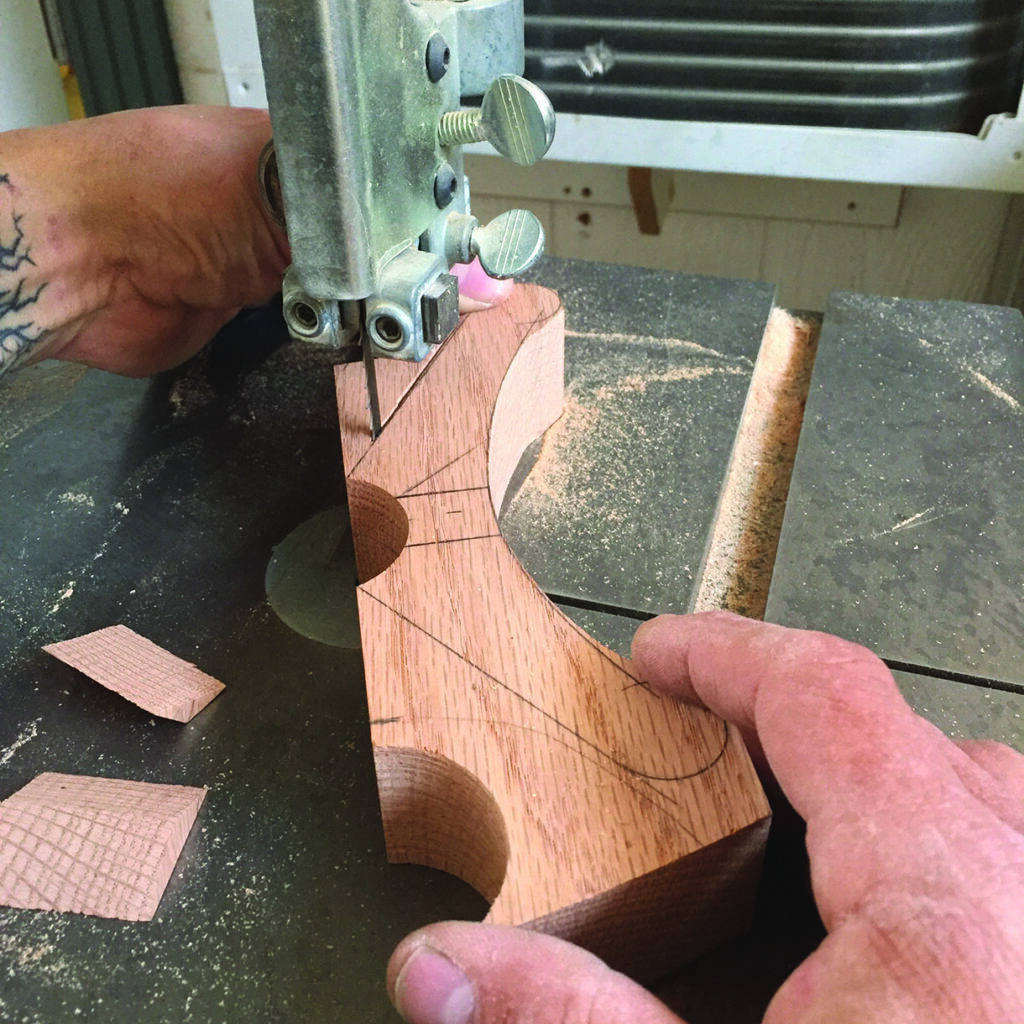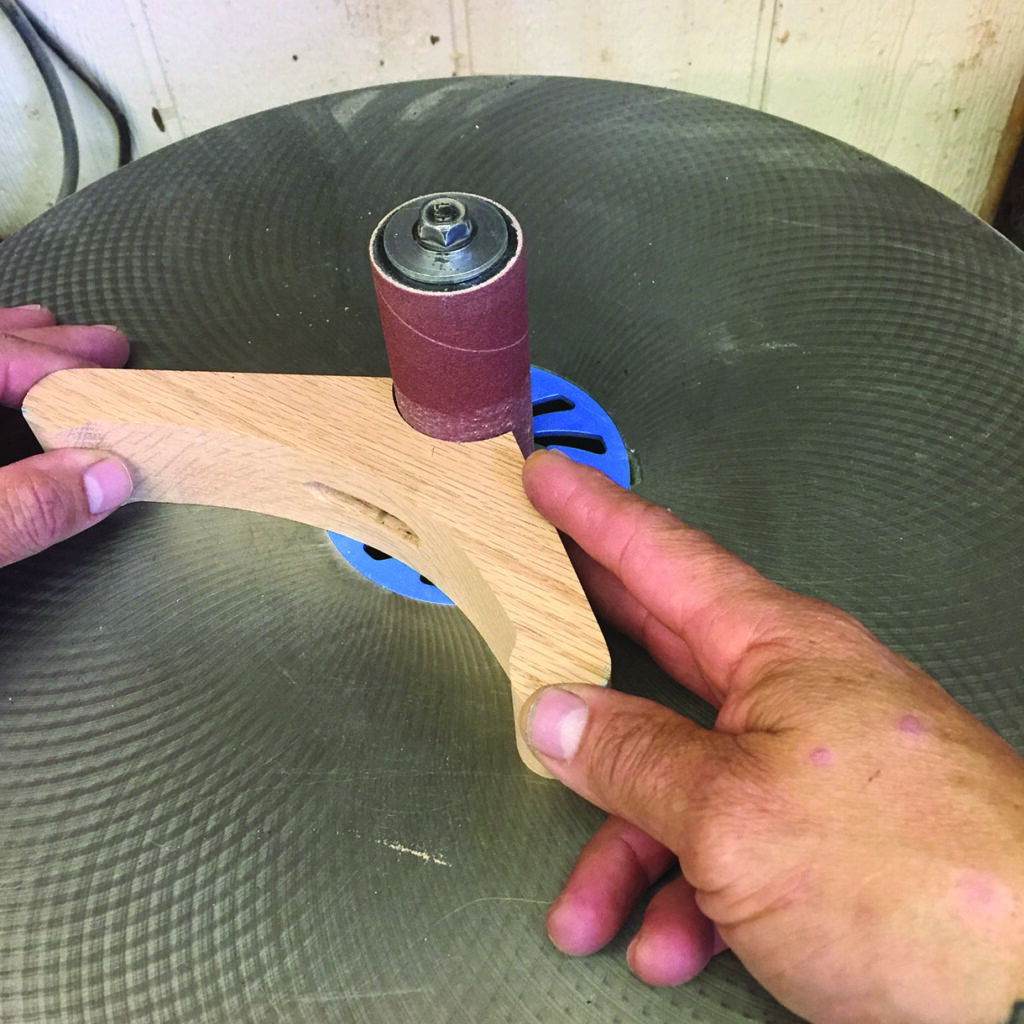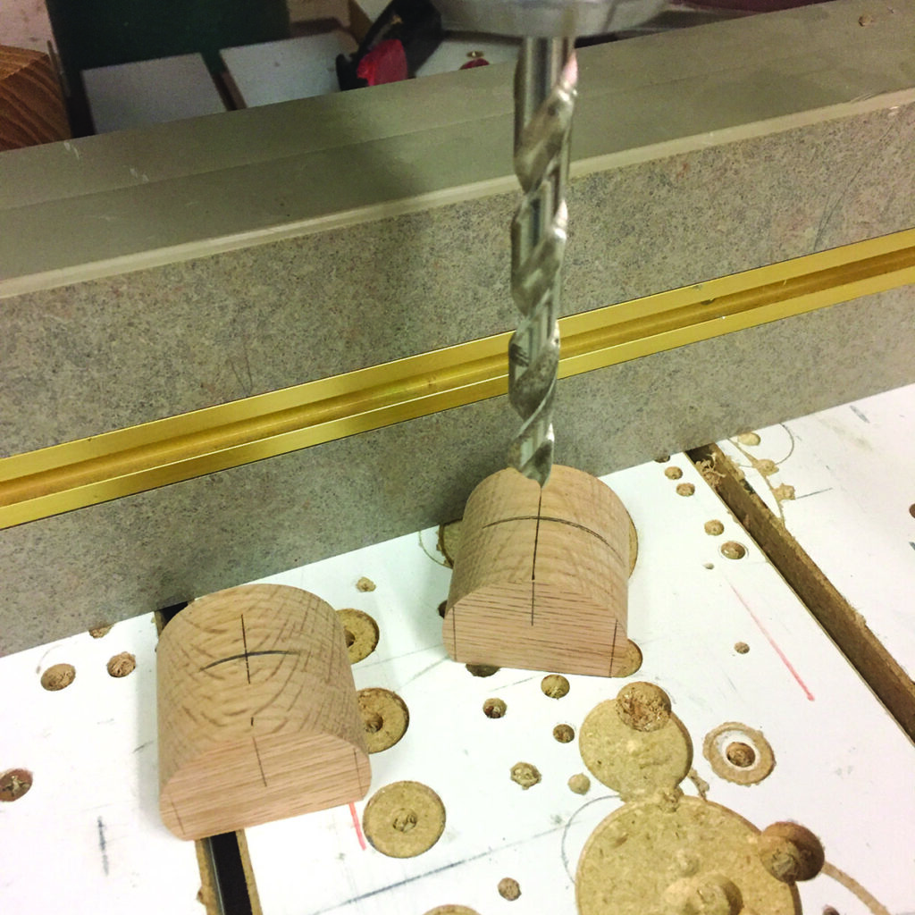 (90mm). To create the circular part without the hole (that usually gets made from the hole saw mandrel drill bit), I made a simple jig or template to guide the hole-saw without the centring drill bit. The main body of the clamp was cut out on the bandsaw after first drilling a one-size-up hole in the body (saddle) to accommodate the circular section. I used my stationary edge sander, an oscillating drum sander and a scraper to clean up the bandsaw marks on all of the pieces. Next, I drilled a hole (25⁄64in or a 64th of an inch larger than a 3⁄8in bit) in the circular sections. The all-thread that I used was 3⁄8in. (Incidentally, I wish the entire world was metric! I find it easier and quicker… but that’s another story.) I secured the pieces that make the main body of the clamps at the drill press fence with spacers underneath for support where needed to drill several overlapping holes. These overlapping and angled holes will allow these shop-made clamps to pivot to accommodate different thickness of materials. I cleaned up the drill bit cuts with a rat-tail file and chamfered the inside edges. I eased all the corners and sanded things smoothly.