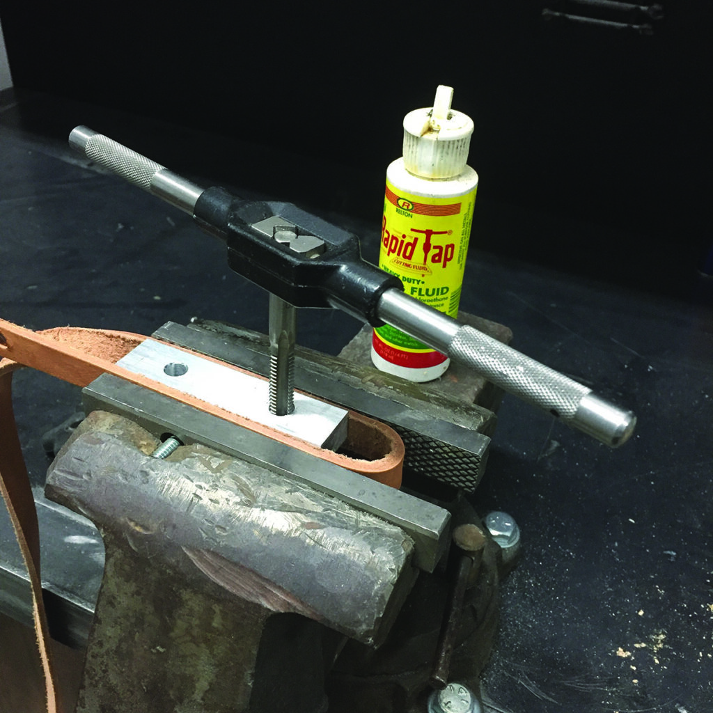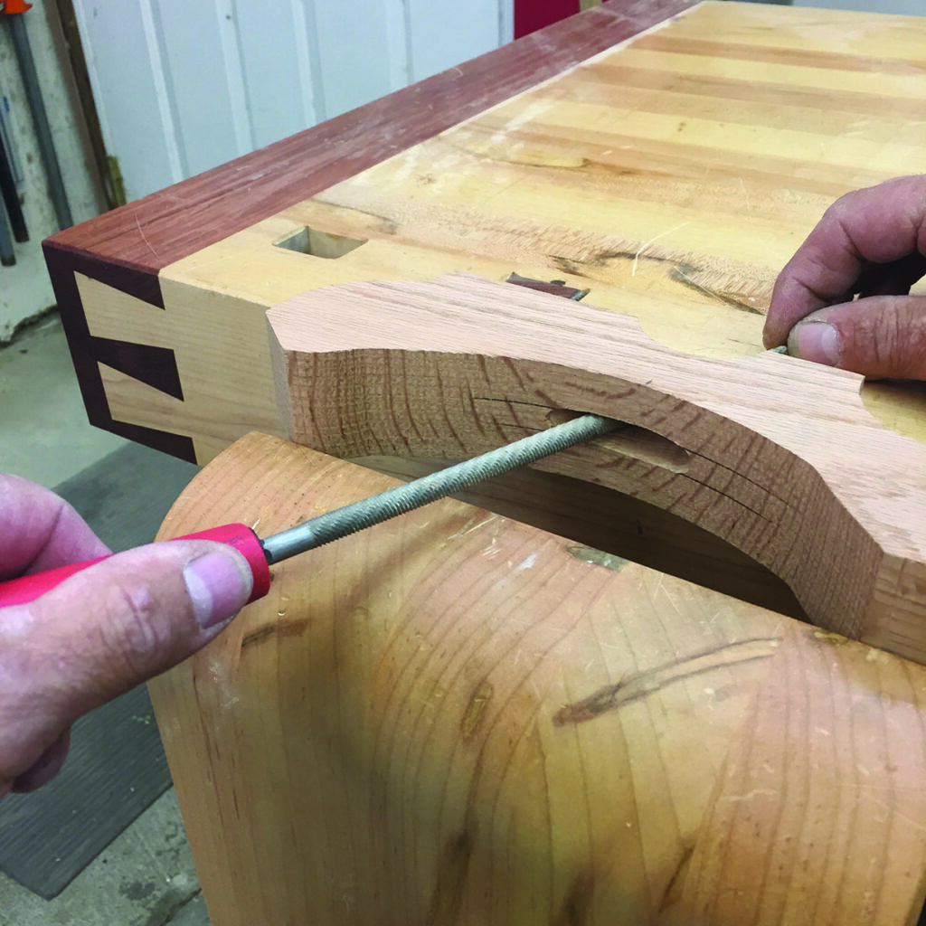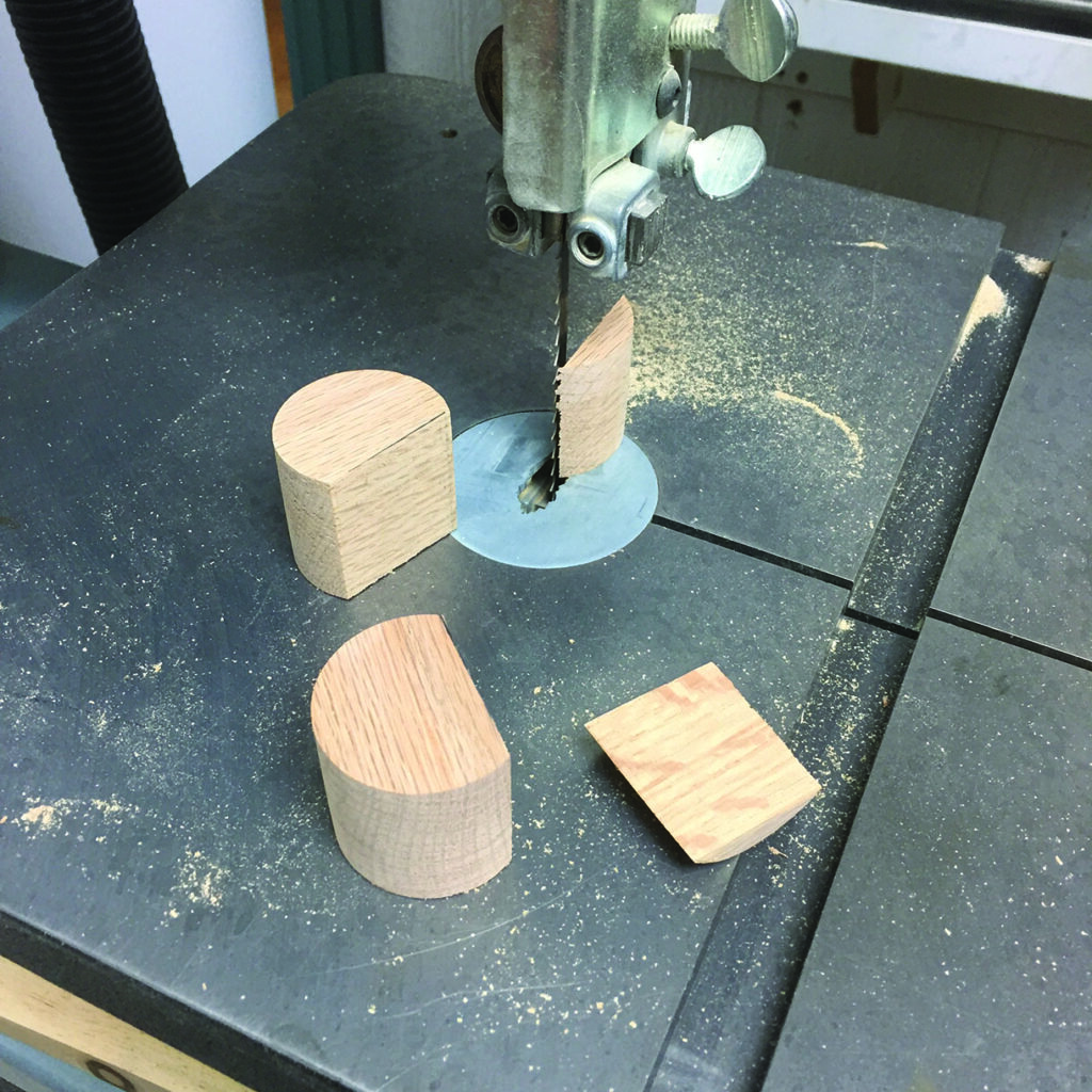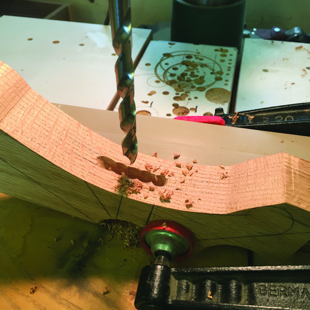 (90mm). To create the circular part without the hole (that usually gets made from the hole saw mandrel drill bit), I made a simple jig or template to guide the hole-saw without the centring drill bit. The main body of the clamp was cut out on the bandsaw after first drilling a one-size-up hole in the body (saddle) to accommodate the circular section. I used my stationary edge sander, an oscillating drum sander and a scraper to clean up the bandsaw marks on all of the pieces. Next, I drilled a hole (25⁄64in or a 64th of an inch larger than a 3⁄8in bit) in the circular sections. The all-thread that I used was 3⁄8in. (Incidentally, I wish the entire world was metric! I find it easier and quicker… but that’s another story.) I secured the pieces that make the main body of the clamps at the drill press fence with spacers underneath for support where needed to drill several overlapping holes. These overlapping and angled holes will allow these shop-made clamps to pivot to accommodate different thickness of materials. I cleaned up the drill bit cuts with a rat-tail file and chamfered the inside edges. I eased all the corners and sanded things smoothly.