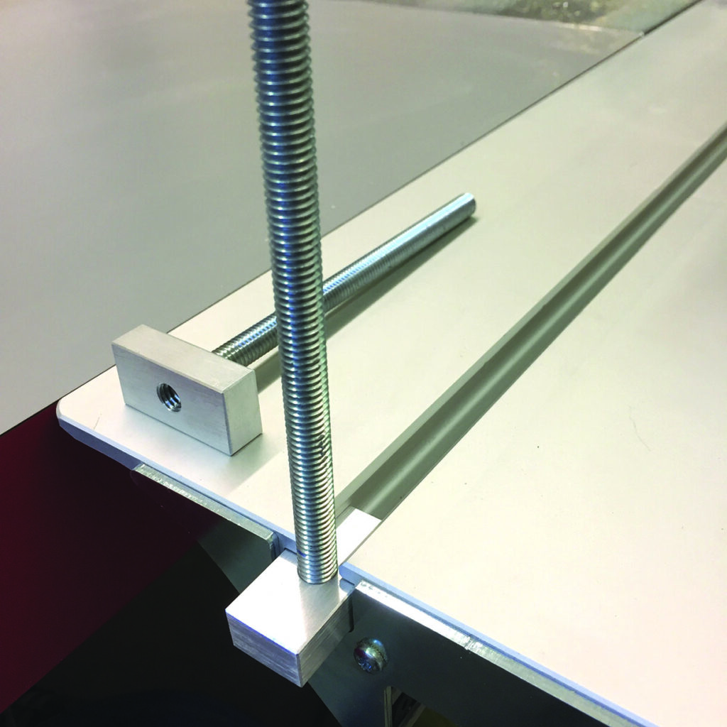 The clamps have an ‘all-thread’ bolt section (about 6in long) that connects to a piece of aluminium with tapped threads. One could use steel bar for this, but I think that the aluminium is plenty strong for this application and is much easier to work with regular woodworking tools. I added a couple of star knobs, although one could easily make these, as well. After adding a couple of coats of an oil/urethane mixture, I let them fully dry. I then added some sandpaper to the points that contact the material and the saw table. This is such an easy way to create a better bite on the clamped timber or sheet goods.